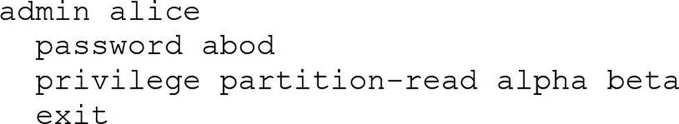 Given the following configuration, which statement describes Alice’s partition access rights?