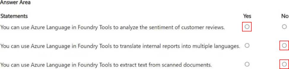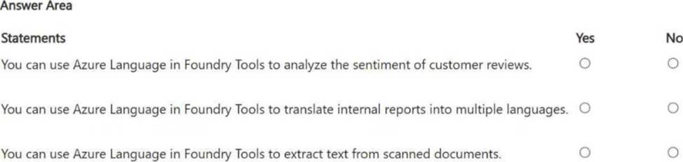 The requirement is to analyze text and identify “people, locations, and companies” mentioned in news articles. This is a classic Named Entity Recognition (NER) / entity extraction scenario, which falls under natural language processing. Azure Language in Foundry Tools is the correct choice because it provides text analytics capabilities that detect and categorize entities in unstructured text― commonly including Person, Location, and Organization. This enables downstream experiences such as topic tagging, search filters (e.g., “all articles mentioning Company X”), trend dashboards (top people/places mentioned this week), and improved content discovery.