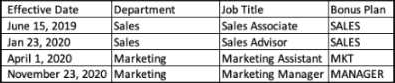 Due to some company reorganizations and rapid career advancement, an employee at your client has the following data in Employee Central: On the Variable Pay template, there is a custom string column that is mapped to the Job Title field on the Job Information portlet in Employee Central. The Effective Date of the template is June 1, 2020. The Bonus Period is from January 1, 2020 to December 31, 2020. What is displayed in the Job Title field when the forms are launched?