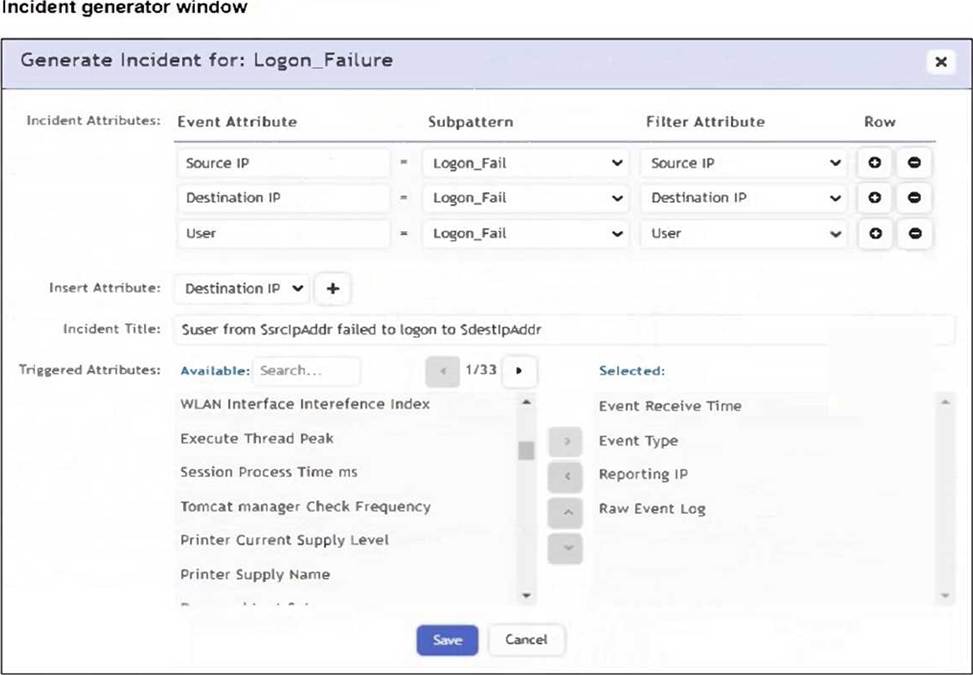 Explanation: For an attribute like Destination Host Name to be used in the incident title, it must first be included in the Triggered Attributes list. Only attributes listed there are available for substitution in the title template (e.g., $destIpAddr, $srcIpAddr).