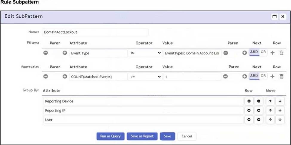 Refer to the exhibit. Which section contains the subpattern configuration that determines how many matching events are needed to trigger the rule?