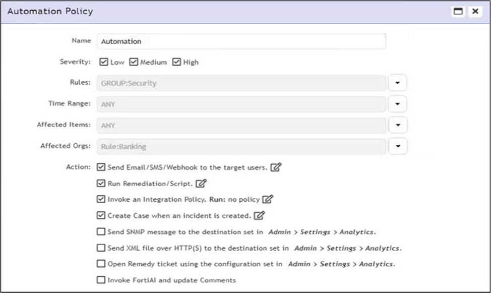 Explanation: When an associated rule triggers, FortiSIEM performs all selected actions in the automation policy. In this case, it will send an email/SMS/webhook, run the remediation script, invoke the integration policy (even if none is currently defined), and create a case. All checked actions are executed.