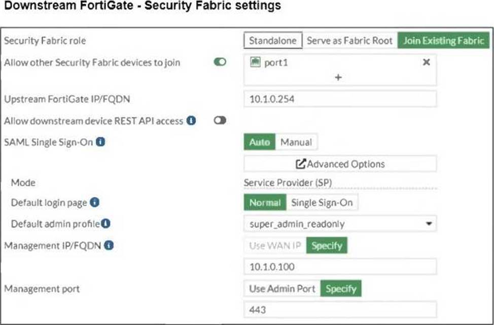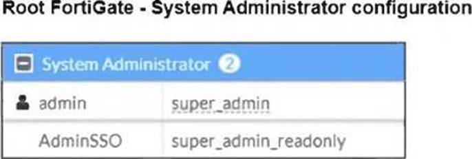 Explanation: From the Root FortiGate - System Administrator Configuration exhibit: ● The AdminSSO account has the super_admin_readonly role. From the Downstream FortiGate - Security Fabric Settings exhibit: ● The Security Fabric role is set to Join Existing Fabric, meaning it will authenticate with the root FortiGate. ● SAML Single Sign-On (SSO) is enabled, and the default admin profile is set to super_admin_readonly. When the AdminSSO user logs into the downstream FortiGate using SSO, the authentication request is sent to the root FortiGate, where AdminSSO has super_admin_readonly permissions. Since the downstream FortiGate inherits this permission through the Security Fabric configuration, the user will be granted super_admin_readonly access.