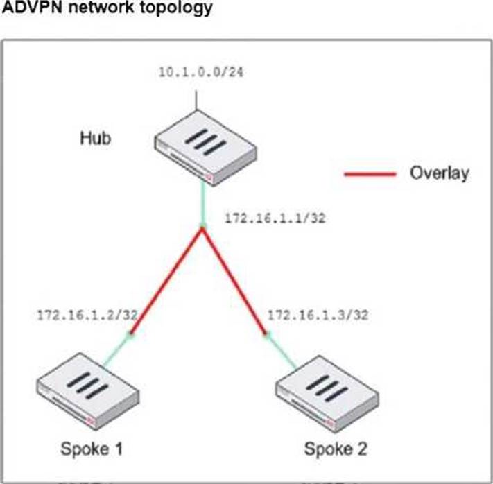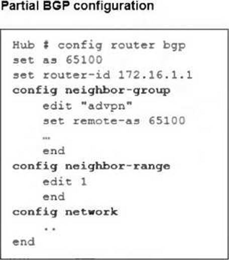 Explanation: In the given ADVPN (Auto-Discovery VPN) topology, BGP is being used to dynamically establish routes between spokes. The neighbor-range configuration is crucial for simplifying BGP peer setup by automatically assigning neighbors based on their IP range. set neighbor-group advpn ● The neighbor-group parameter is used to apply pre-defined settings (such as AS number) to dynamically discovered BGP neighbors. ● The advpn neighbor-group is already defined in the configuration, and assigning it to the neighbor-range ensures consistent BGP settings for all spoke neighbors. set prefix 172.16.1.0 255.255.255.0 ● This command allows dynamic BGP peer discovery by defining a range of potential neighbor IPs (172.16.1.1 - 172.16.1.255). ● Since each spoke has a unique /32 IP within this subnet, this ensures that any spoke within the 172.16.1.0/24 range can automatically establish a BGP session with the hub.