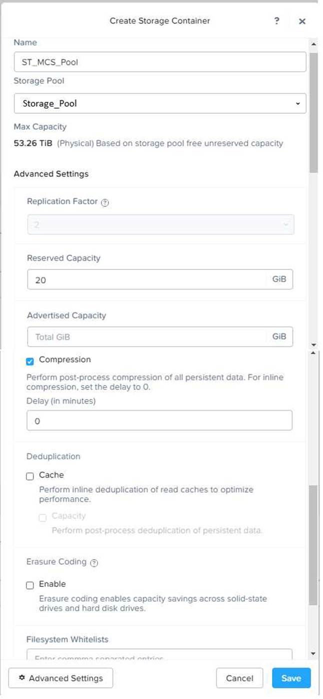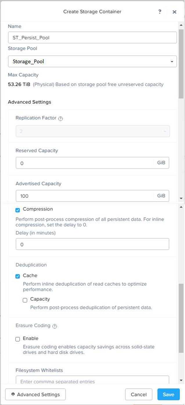 Under Advanced Settings, enable Deduplication and Compression to reduce the storage footprint of the non-persistent desktops. You can also enable Erasure Coding if you have enough nodes in your cluster and want to save more space. These settings will help you optimize the storage capacity for the non-persistent pool.