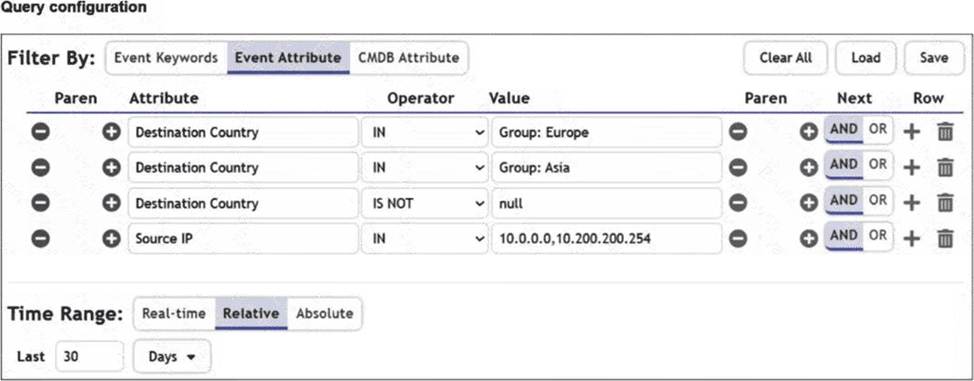 Explanation: From FortiSOAR 7.6., FortiSIEM 7.3 Exact Extract study guide: Analyzing the Query Configuration exhibit in the context of FortiSIEM 7.3 search logic reveals several syntax and logical errors that prevent the query from returning results: Logical Operator Error (E): The user intends to find traffic to Europe OR Asia. In the exhibit, the first row (Group: Europe) is followed by a default AND operator. This forces the query to look for a single flow where the destination is simultaneously in Europe and Asia, which is logically impossible. It must be changed to OR. Missing Parentheses (C): When combining OR and AND logic in FortiSIEM, parentheses are required to define the order of operations. Without them, the query might evaluate "Asia AND Destination Country IS NOT null AND Source IP IN..." first. To correctly find (Europe OR Asia) that also matches the LAN segment, parentheses must group the first two rows. Incorrect Operator for IP Range (D): The exhibit uses the IN operator for the value 10.0.0.0,