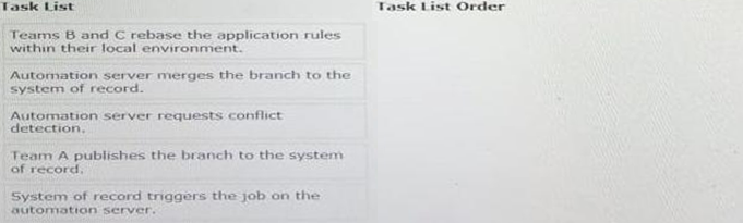 DRAG DROP You are managing distributed, geographically dispersed, development teams A, B and C. Team A is ready to merge changes into their development environment to make available changes to Team B’s Team C’s. To ensure all development teams are working with the latest version of shared rule base, select and move all of the following tasks to the tasks List Order column and place them in the correct order.
