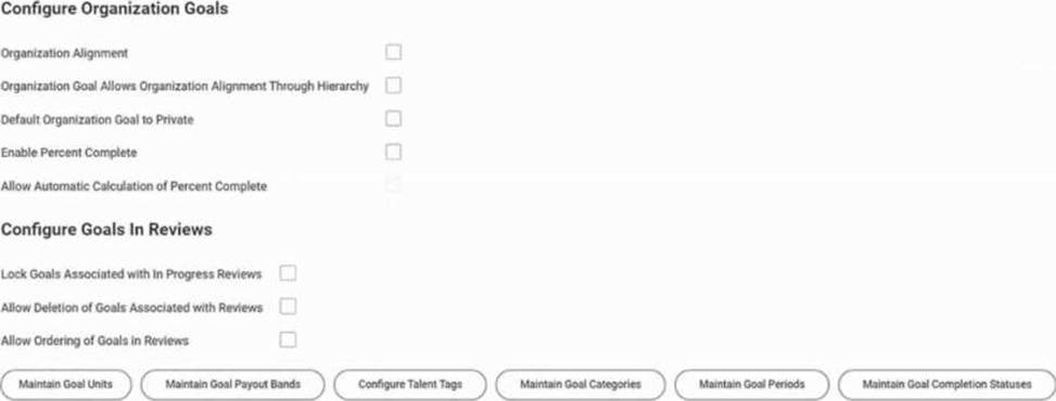Explanation: In the scenario, each worker’s goal must fall under one of three groupings: Innovation, Financial, Productivity. These groupings are set up using Goal Categories. The Maintain Goal Categories task allows administrators to define these categories and enforce categorization for goal entry. Incorrect options: Configure Goals in Review section → affects reviews, not groupings. Configure Organization Goals section → applies to enterprise-level goals, not categorization. Configure Talent Tags task → defines tags used for reporting, not enforced groupings. Reference: Workday Goal Management admin setup: “Use Maintain Goal Categories to define groupings for goals.” Workday Pro Talent & Performance certification material: Goals must be categorized via categories, not talent tags.